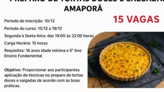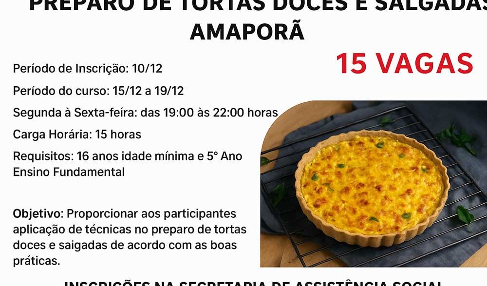 Educação Notícias Amaporã Abre Inscrições Para Curso Gratuito de Preparo de Tortas Doces e Salgadas Amaporã abriu inscrições para curso gratuito de tortas doces e salgadas, com 15 vagas e aulas de 15 a 19 de dezembro. 09/12/2025