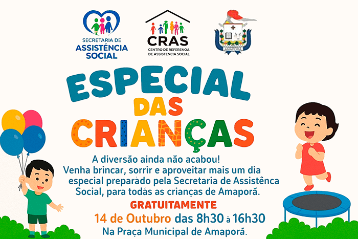A diversão vai continuar em Amaporã! A Secretaria Municipal de Assistência Social, por meio do CRAS (Centro de Referência de Assistência Social), promove neste dia 14 de outubro, das 8h30 às 16h30, o evento “Especial das Crianças”, na Praça Municipal de Amaporã.