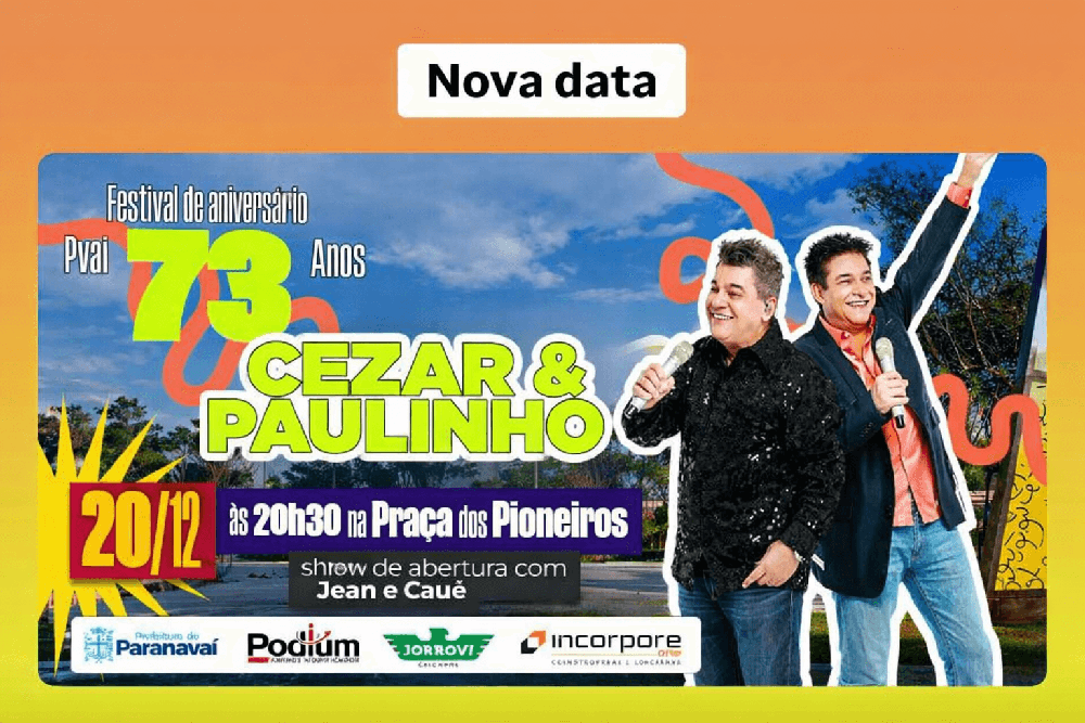 A Prefeitura de Paranavaí confirmou a nova data do aguardado show da dupla Cezar & Paulinho, que integra a programação oficial do Festival de Aniversário de Paranavaí – 73 anos. A apresentação acontece no dia 20 de dezembro, a partir das 20h30, na Praça dos Pioneiros, com entrada gratuita.